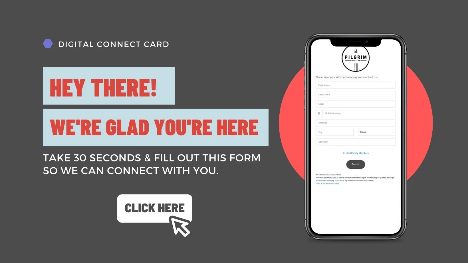 We are so glad you have found us! We hope you can take 30 seconds to fill out this digital connect card so that we can connect you with the life and mission here at Pilgrim!
